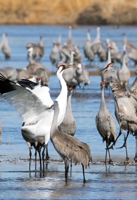 One of these is not like the others . . . but he does belong. Every year hundreds of thousands of Sandhill cranes congregate on the Platte River during their spring migration, forming large flocks that use the sandbars of the Platte River as a nighttime refuge before dispersing to local fields to feed during the day. Here, a rare whooping crane joins them. With less than 600 left, any sighting of a whooping crane is to be treasured. BTW, Sandhill cranes are named after the Sandhills Region of Nebraska, where a crane fossil from the Miocene, thought to be about ten million years old, was found that is almost identical to today's cranes.